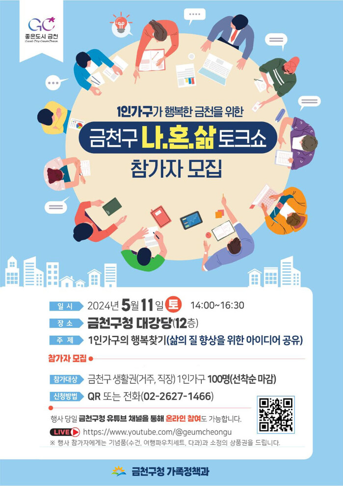 [시민일보 = 여영준 기자] 서울 금천구(구청장 유성훈)는 오는 11일 오후 2시 구청 대강당에서 1인가구 100명이 참여하는 ‘금천구 나.혼.삶 토크쇼’를 개최한다고 밝혔다.