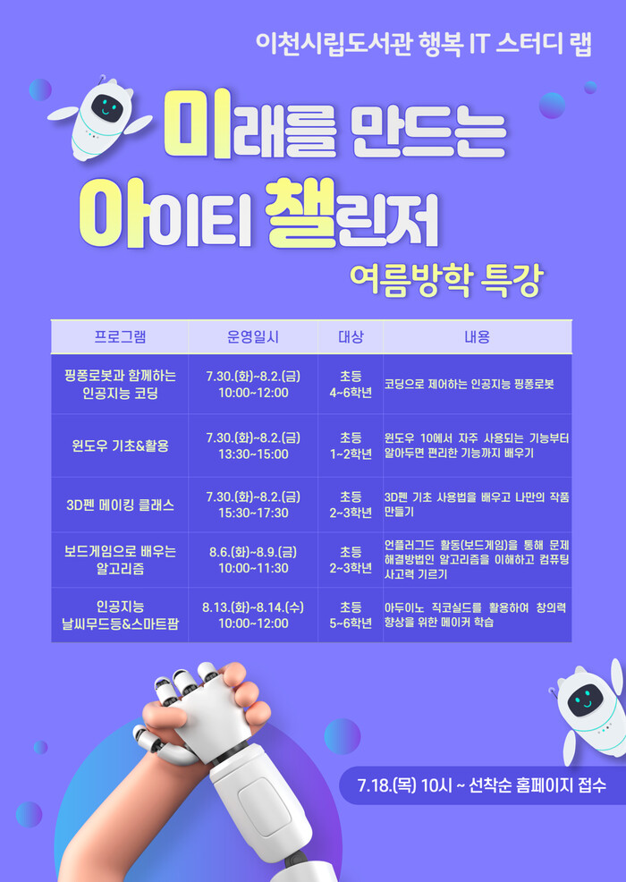 [시민일보 = 민장홍 기자] 경기 이천시립도서관은 오는 30일부터 '미래를 만드는 IT 챌린저'(이하 미아챌) 여름방학 특강을 운영한다.