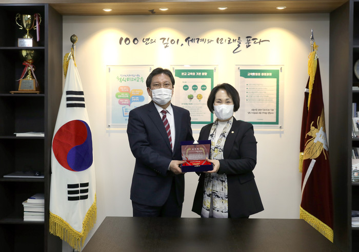 | ▲ 박경희 의장(오른쪽)이 인창고등학교로부터 감사패를 전달 받고 기념촬영을 하는 모습. (사진제공=서대문구의회) |
