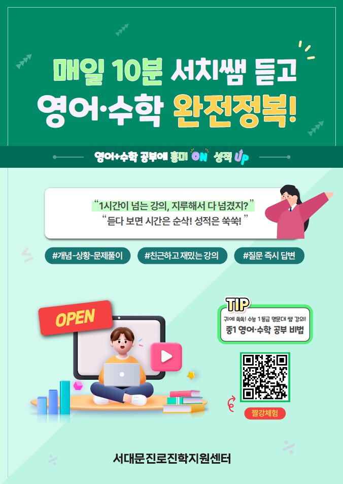 [시민일보 = 이대우 기자] 서울 서대문구(구청장 이성헌)가 운영하는 서대문진로진학지원센터(수색로 43, 4층)에서 지역내 학생들을 대상으로 ‘중학교 1학년 영어 수학 온라인 강의’ 수강생을 모집한다고 2일 밝혔다.