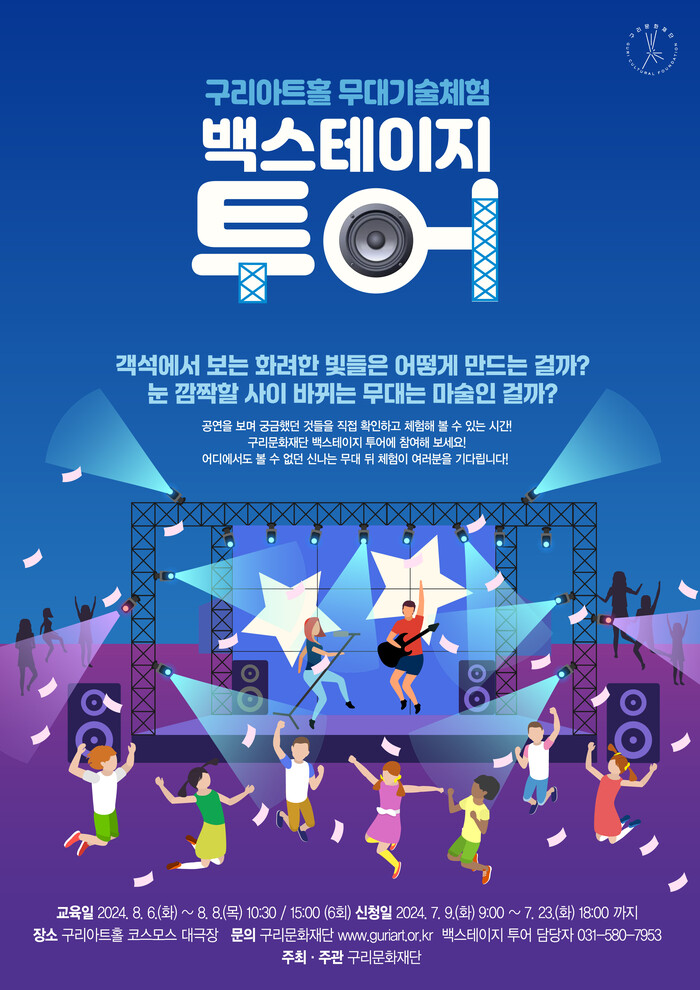 이번 백스테이지 투어는 구리아트홀의 전문 무대 스태프들과 함께 평소에 쉽게 접하기 어려운 무대공간을 체험하며 공연예술에 대한 이해도를 높이고 문화예술에 대한 장벽을 낮추고자 마련됐으며, 오는 8월6~8일 사흘간 매일 2회씩 구리아트홀 코스모스 대극장에서 진행될 예정이다.
