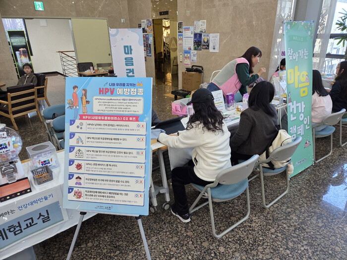 서울 서초구는 제54회 보건의 날(4월7일)을 맞아 지난 8일 백석예술대학교 백석비전센터에서 ‘백석예대 건강실천의 날’ 행사를 개최했다. 사진은 건강측정 부스에서 참여자들이 마음건강 프로그램을 체험하는 모습. (사진=서초구청 제공)