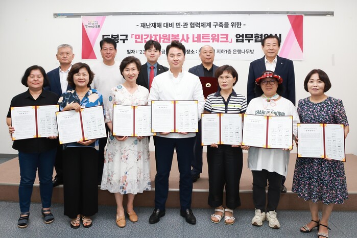 서울 도봉구는 새마을운동 도봉구지회 등 12개 기관 및 단체와 ‘민간자원봉사 네트워크’ 구축을 위한 업무협약을 체결했다. 사진은 협약식에서 오언석 구청장(앞줄 가운데)과 관계자들이 기념촬영을 하는 모습. (사진=도봉구청 제공)