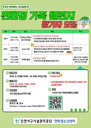 [인천=김형만 기자] 인천 서구시설관리공단 연희청소년센터는 9월 23일부터 “찐환경가족 챌린지”참가가족을 모집한다고 밝혔다.