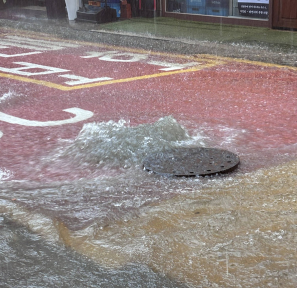| ▲ 집중호우 시 맨홀에서 하수가 역류하는 모습. (사진=구로구청 제공) |