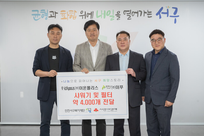 [인천=문찬식 기자] 인천 서구(구청장 강범석)는 지난 16일 ㈜이온폴리스(대표 황규진)와 (주)이푸(대표 김재준)가 샤워기 및 필터 4,000여 개를 서구복지재단에 기부했다고 밝혔다. 이날 기부된 물품은 서구의 청년들에게 지원될 예정이다.