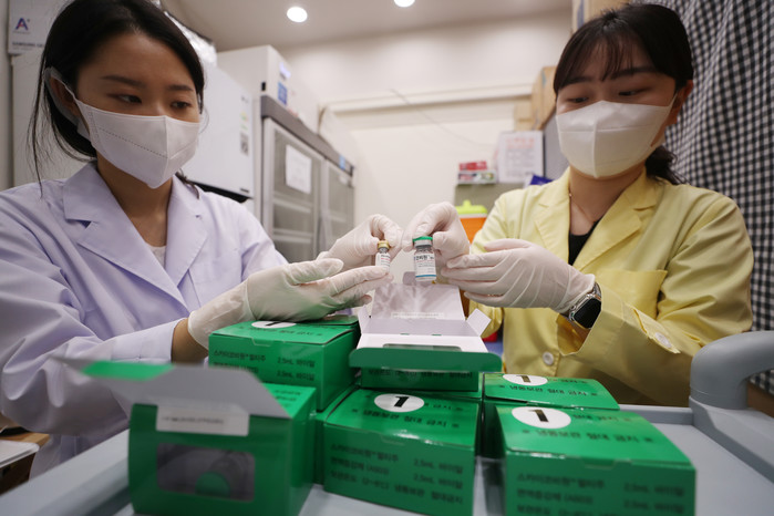국산백신인 스카이코비원 접종 첫날인 5일 오전 광주 북구보건소에서 감염병예방팀 직원들이 지역내 의료기관에 나눠줄 스카이코비원 백신 수량을 점검하고 있다.