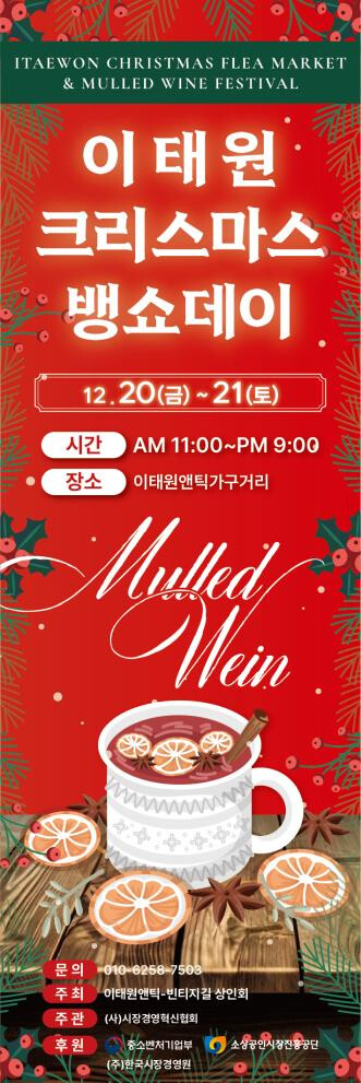 구 관계자는 “이태원 앤틱가구거리의 고유한 개성과 문화가 살아있는 벼룩시장과 겨울철 대표 음료인 뱅쇼를 중심으로 연말 분위기를 만끽하실 수 있을 것”이라 말했다.