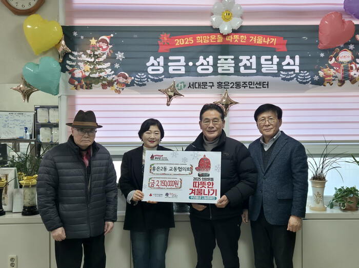 [시민일보 = 이대우 기자] 서대문구 홍은2동(동장 조중훈)은 최근 홍은2동 교동협의회(회장 박준수 목사)가 ‘2025 희망온돌 따뜻한 겨울나기 성금’을 기탁해 주위를 훈훈하게 했다고 3일 밝혔다.