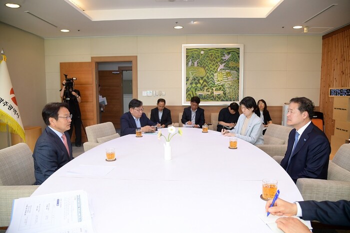 | ▲ 강기정 광주광역시장이 27일 시청 접견실에서 김영호 통일부 장관과 면담을 갖고, ‘광주2025세계양궁선수권대회’ 북한 선수단 참여와 관련 특사 파견을 제안했다./ 광주광역시 제공 |