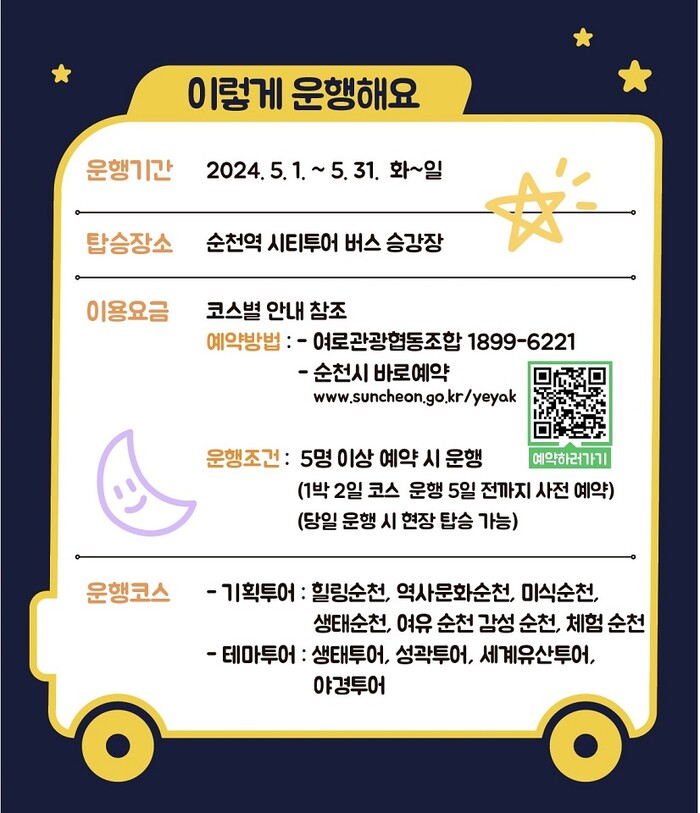시티투어 버스타고 ‘달디달고 달디단 밤순천, 봄순천’이라는 주제로 순천의 낮 뿐만 아니라 밤도 즐길 수 있는 코스를 선보인다.