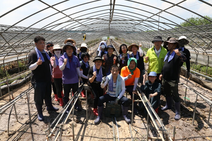 실제 현장에서는 36도에 달하는 붙볕더위에도 불구하고 비닐하우스 내 잔해와 토사 정리는 물론 손상된 농작물 전체를 이동시켜 폐기하는 작업에 참여했다.