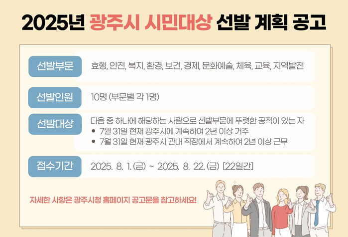 [광주=전용원 기자] 경기 광주시는 ‘2025년 광주시 시민 대상’ 선발 계획을 공고하고, 시정 발전에 기여한 시민 공로자를 공개 모집한다고 1일 밝혔다.