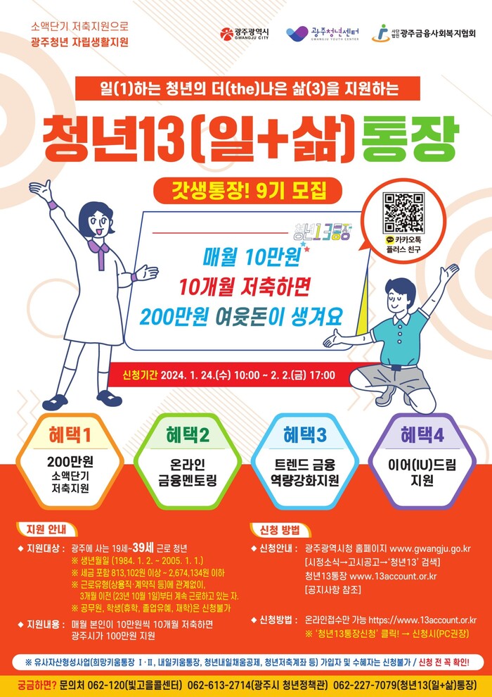 자세한 사항은 광주시 누리집 고시/공고, 광주청년정책플랫폼 또는 청년금융복지지원센터 누리집에서 확인할 수 있다. 문의는 빛고을 콜센터, 청년금융복지지원센터, 광주시 청년정책관, 카카오톡채널 ‘청년금융복지지원센터’로 하면 된다.