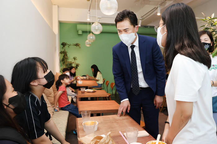 오언석 서울 도봉구청장은 지난 18일 ‘청소년 마을식당’ 1주년 한살데이(DAY)를 기념해 ‘마을활력소 초록뜰’과 ‘초록카페’를 방문해 지역 청소년들을 만나 함께했다. 사진은 ‘청소년 마을식당’ 1주년 한 살데이(DAY)에 참석해 오 구청장(오른쪽 두 번째)이 청소년들과 이야기를 나누고 있는 모습. (사진제공=도봉구청)