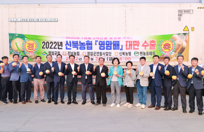[영암=정찬남 기자] 전남 영암군은 최근 신북농협 농산물 산지유통센터에서 ‘영암배’ 대만 수출 선적식을 가졌다.