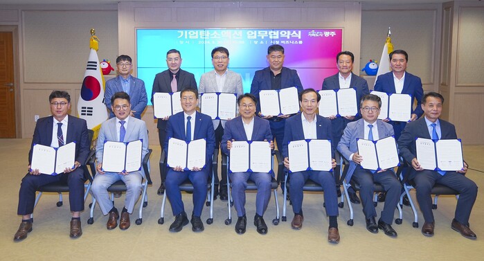 시는 30일 시청 비즈니스룸에서 중소ㆍ중견기업 12개사, 한국에너지공단과 ‘광주 2045 탄소중립을 위한 기업탄소액션 업무협약’을 체결했다.