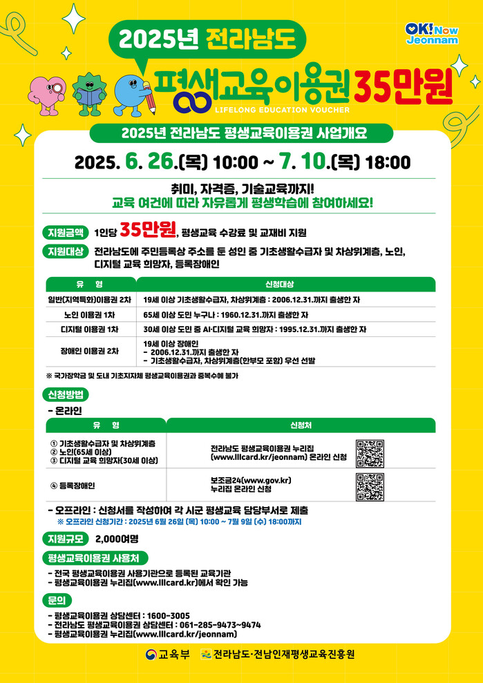 저소득층, 노인, 디지털 교육 희망자는 전남도 평생교육이용권 홈페이지에서, 장애인은 보조금24에서 신청하면 된다.