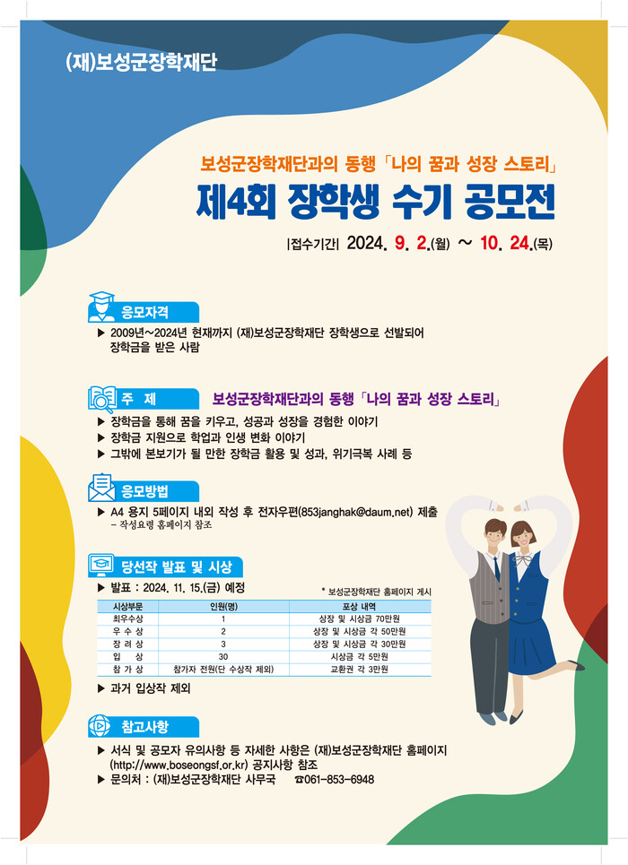 이번 공모전은 보성군장학재단의 장학금을 받은 학생들이 자신의 꿈과 성장 이야기를 공유하는 기회를 제공하기 위해 마련됐으며, 이를 통해 장학재단과 함께 한 여정을 되돌아보는 의미 있는 시간이 될 것으로 기대한다.