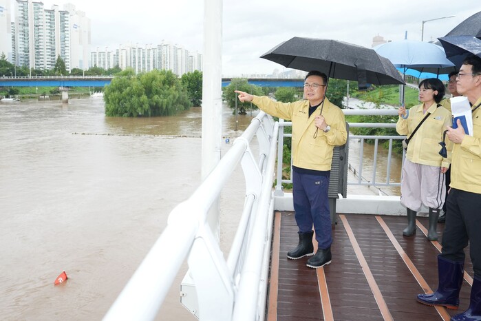 | ▲ 지난해 8월 중랑천 홍수주의보 발표에 따라 긴급 현장 점검을 하는 류경기 중랑구청장. (사진=중랑구청 제공) |