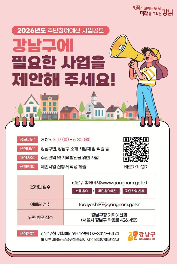 [시민일보 = 이대우 기자] 강남구(구청장 조성명)가 17일~6월30일 2026년도 예산편성에 반영할 총 20억 규모의 주민참여예산 제안사업 공모를 진행한다.