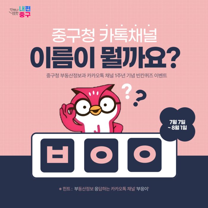 구는 ‘부응이’ 1주년을 기념하여 8월1일까지 빈칸 퀴즈 이벤트를 진행한다. 카카오톡 검색창에 ‘서울 중구 부동산정보과’ 또는 ‘부응이’를 입력해 채널을 추가한 후, 채팅 화면 하단의 이벤트 신청을 클릭하고 퀴즈를 풀면 이벤트에 응모할 수 있다.