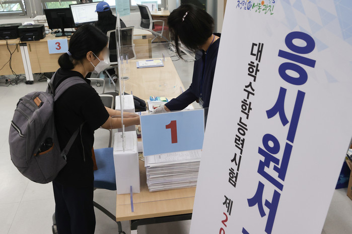 2023학년도 대학수학능력시험(수능) 원서 접수가 시작되는 18일 오전 한 수험생이 서울 성동광진교육지원청에서 원서를 접수하고 있다.
