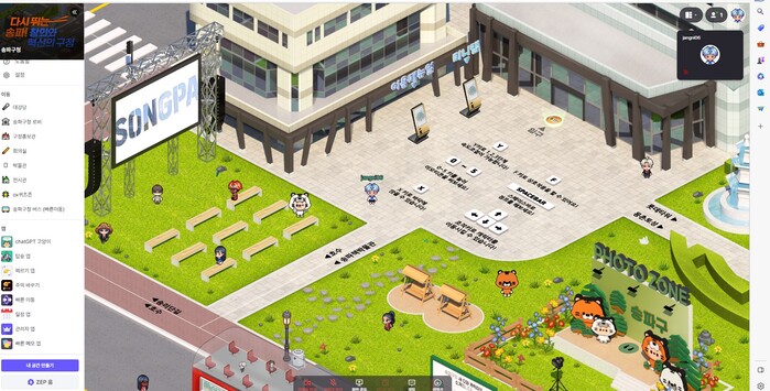 이밖에도 댓글 기능이 있는 방명록, 내 공간 만들기 등 다양한 기능과 구청 외부 공간에 석촌호수, 송리단길, 롯데월드타워 등을 배치해 재미와 활용 폭을 넓혔다.