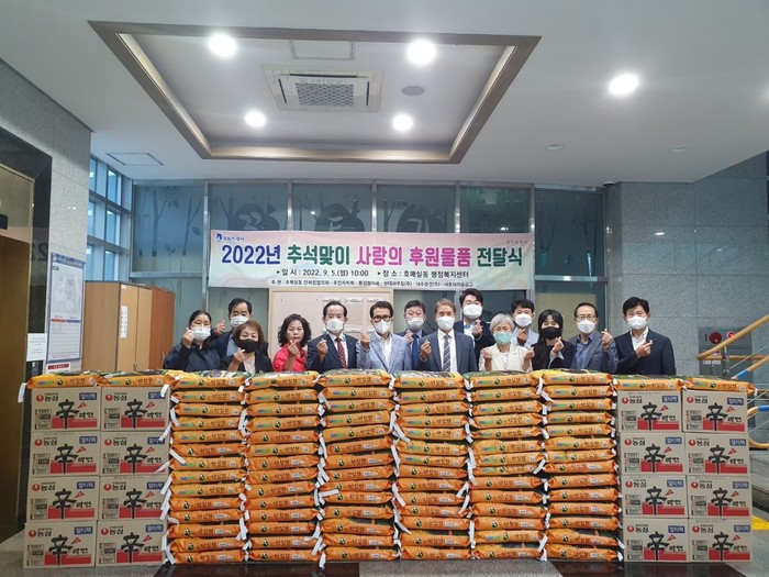 경기 수원시 권선구 호매실동은 5일 추석을 맞아 이웃사랑 후원물품 전달식을 열었다. 호매실동은 호매실동 주민자치회 등 11개 단체, 서호새마을금고 및 지역내 유관기관 등 개인 후원자들로부터 백미 150포(400만원 상당), 라면 등 후원물품을 기부받았으며, 물품은 지역내 기초생활수급자 500여가구에 전달될 예정이다. 사진은 관계자들이 기념촬영을 하는 모습. (사진제공=권선구청)