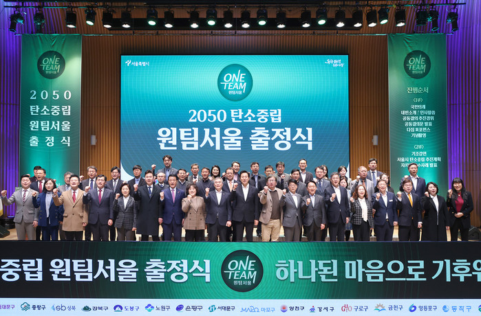 서울 도봉구가 27일 서울시 주최 ‘2050 탄소중립을 위한 원팀(ONE TEAM), 서울 출정식’에 함께했다. 행사는 1부에서는 서울시-자치구 공동결의문 발표 등을, 2부에서는 국가 2050 탄소중립위원회 위원장의 기조강연 및 탄소중립 이행 우수사례를 발표했다. 사진은 ‘2050 탄소중립 원팀서울 출정식’서 오언석 구청장(앞줄 왼쪽 여섯 번째)과 참석자들이 기념촬영을 하고 있는 모습. (사진=도봉구청 제공)