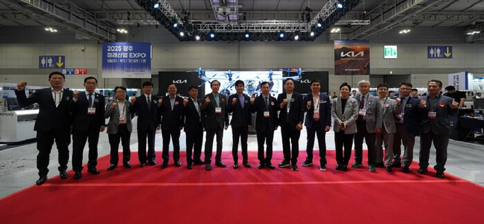 | ▲ 고광완 광주시행정부시장(왼 쪽부터 9번 째)이 25일 김대중컨벤션센터에서 열린 '2025 광주미래산업엑스포 개막식'에 참석해 참석자들과 기념촬영을 하고 있다. /광주광역시 제공 |