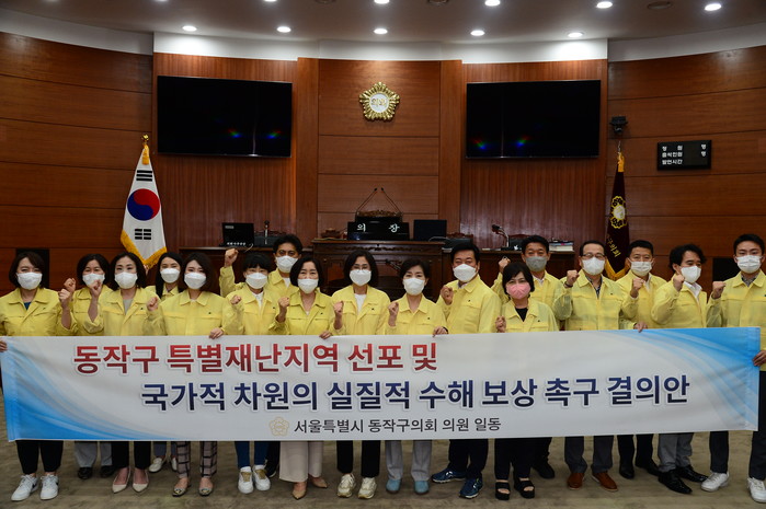구의회는 결의문을 통해 "지난 8일 기록적 폭우로 주택침수와 감전으로 인한 2명의 인명피해를 비롯해, 막대한 재산피해와 수많은 이재민이 생겨 대피하는 등 심각한 재난 상황에 직면해 있는 만큼, 정부가 신속한 대응과 빠른 복구, 현실적인 보상이 이루어지도록 동작구를 특별재난지역으로 선포하여 국가적 차원의 실질적 수해보상이 이루어질 수 있도록 하고, 근본적인 수해 재발방지 대책을 수립해 줄 것"을 강력히 촉구했다.