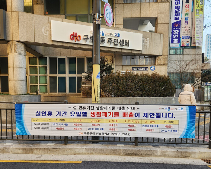 | ▲ 구로5동 주민센터 앞에 설치된 설 연휴 생활폐기물 배출 안내 현수막. 구로구는 각 동별 주요 지점에 현수막을 설치해 배출일 변경 사항을 사전 안내하고 있다. (사진=구로구청 제공) |