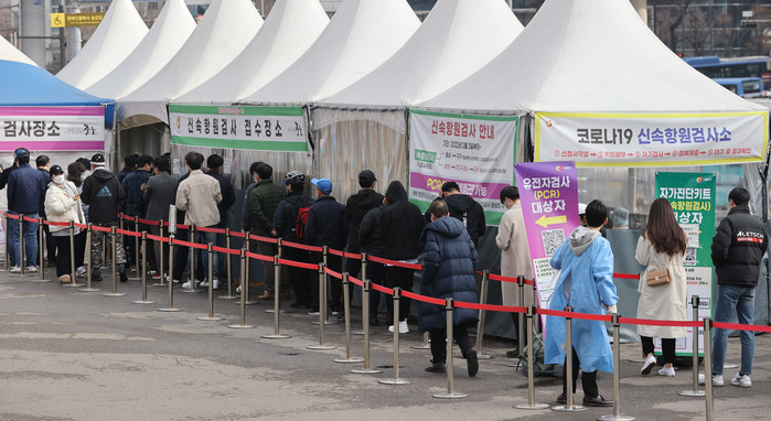 오미크론 변이가 확산하면서 15일 코로나19 신규 확진자는 36만명대를 기록했고 누적 확진자는 700만명을 넘었다. 신규 확진자가 연일 30만명을 크게 웃돌면서 이날 발표된 위중증 환자와 사망자도 국내 코로나19 사태 이후 2년여 만에 가장 많았다. 중앙방역대책본부는 이날 0시 기준으로 신규 확진자가 36만2338명 늘어 누적 722만8550명으로 집계됐다고 밝혔다. 사진은 이날 오전 서울역 선별진료소 모습.