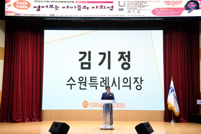 | ▲ ‘학교사회복지사업 부모공감 콘서트’에 참석한 김기정 의장이 인사말을 하고 있다. (사진=수원시의회 제공) |