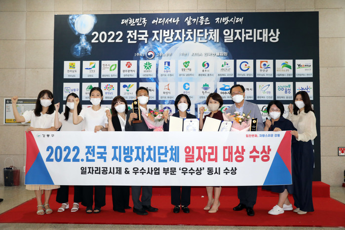 서울 강동구는 최근 고용노동부 주관 ‘2022년 전국 지방자치단체 일자리대상’에서 전분야 우수상을 받았다. 구는 기존의 베드타운 이미지에서 벗어나 역동적인 경제 중심 도시로 거듭나기 위한 업무단지 조성 및 지역일자리 창출 실적 등의 노력을 높이 평가받았다. 사진은 이수희 구청장(오른쪽 다섯 번째)과 관계자들이 기념촬영을 하는 모습. (사진제공=강동구청)