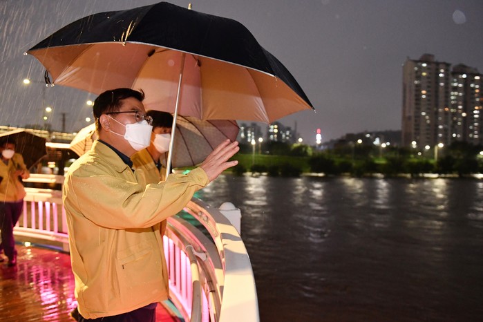 류경기 서울 중랑구청장이 지난 9일 오후 7시30분 수해 취약 지역인 중랑천 장안교 현장을 긴급 방문했다. 류 구청장은 육교와 동부간선도로 등 진출입로 통제와 차단 상황을 점검하고 천변의 체육시설과 물놀이장 등 구민들이 많이 찾는 시설물을 꼼꼼히 살폈다. 사진은 류 구청장이 관계자들과 현장 상황을 점검하고 있는 모습. (사진제공=중랑구청)