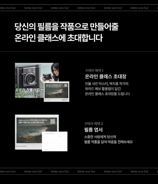 한국후지필름은 ‘인스탁스 와이드 에보’ 출시를 기념하여 다양한 이벤트를 준비했다. 구매자들에게 프라이빗 온라인 사진 클래스 초대장을 제공한다. 해당 클래스는 와이드 에보를 처음 사용하는 사용자들을 위한 전문 사진작가가 기본 개념부터 실습까지 알려주는 종합 가이드다. 제품 기능 소개, 즉석 카메라 활용법, 다양한 효과 조합으로 나만의 감성 프레임 찾기, 인물 촬영, 풍경 촬영 실습 등 다채로운 커리큘럼으로 구성됐다.