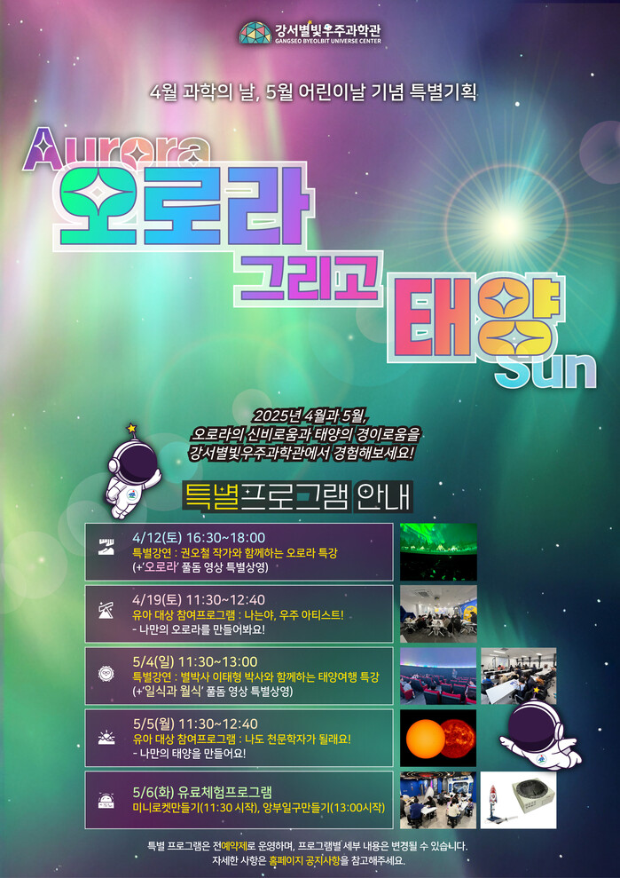 심재현 강서별빛우주과학관장은 “과학의 날과 어린이날을 맞아 우주에 관심 있는 어린이들을 위해 ‘오로라, 그리고 태양’ 특별기획전을 준비했다”며 “이번 특별전을 통해 우주와 더 가까워지는 특별한 시간이 되길 바란다”고 말했다.