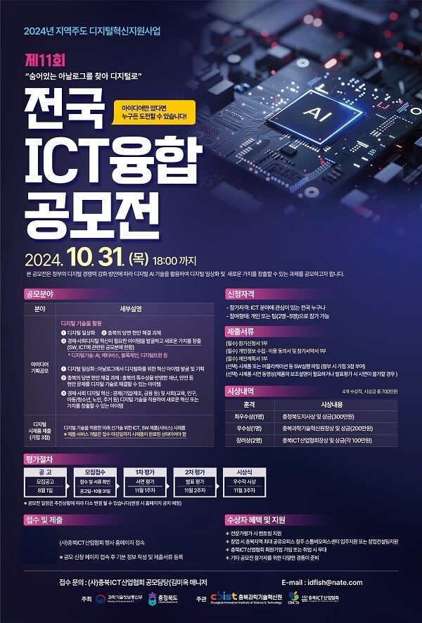 한편 제11회 전국 ICT융합 공모전은 오는 10월 31일 오후 6시까지 신청 마감이며, 보다 자세한 사항은 '충북ICT산업협회 홈페이지에서 확인할 수 있다.