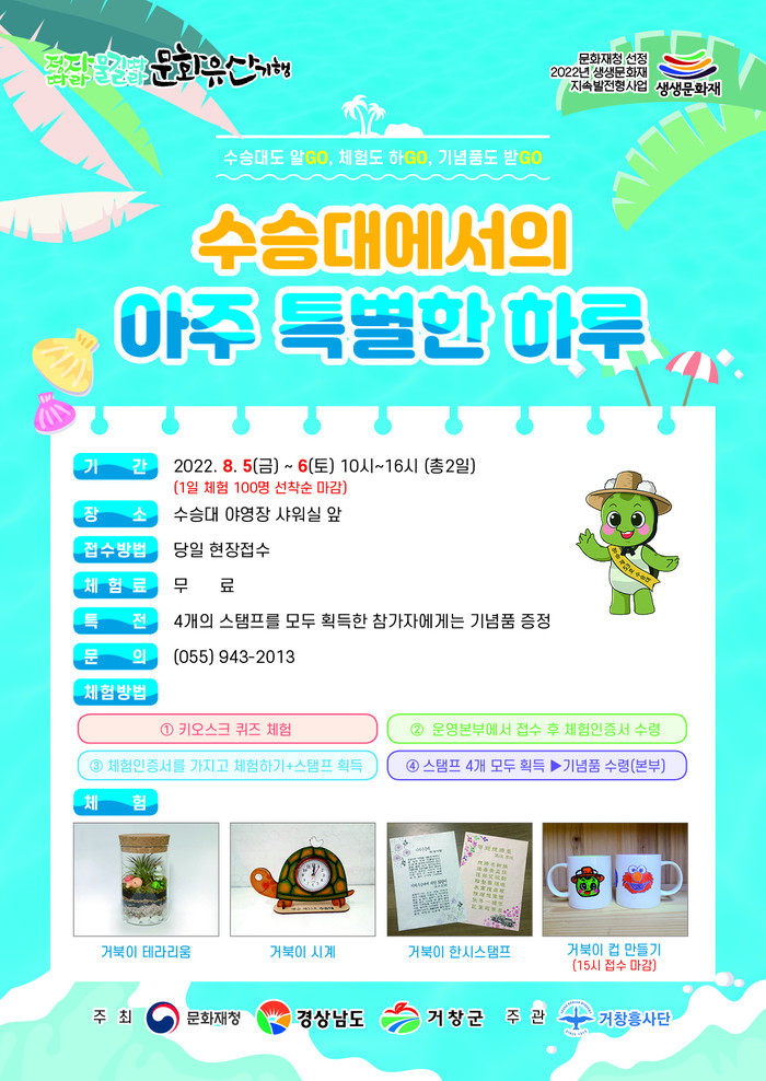 수승대를 알아보는 키오스크 퀴즈 체험 및 거북이 테라리움, 거북이 시계, 거북이 한시스탬프, 거북이 컵 만들기 등의 체험 프로그램이 준비되어 있으며, 체험 스탬프를 획득한 참여자는 기념품도 받을 수 있다.