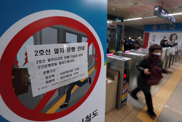 26일 오전 부산 도시철도 2호선 사상역에서 시민들이 열차에서 내려 셔틀버스 타기위해 이동하고 있다. 부산 도시철도 2호선 사상~화명역 구간이 열차 탈선으로 운영이 중단됐다. 2호선 장산∼사상역은 10분, 화명∼양산역 구간은 8분 간격으로 정상 운행한다.(사진제공 = 연합뉴스)