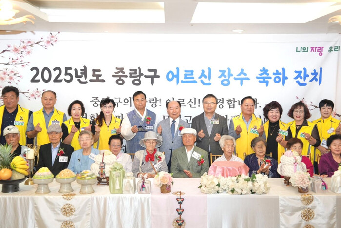 [시민일보 = 여영준 기자] 중랑구(구청장 류경기)는 지난 26일, 중랑구 효사랑봉사회 주관으로 ‘2025년 중랑구 어르신 장수 축하 잔치’를 열고 동별 최고령 어르신과 가족들을 초청해 감사의 마음을 전하는 뜻깊은 시간을 가졌다.