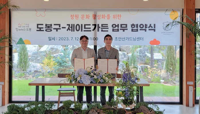 서울 도봉구가 정원문화 활성화를 위해 최근 제이드가든과 협약을 체결했다. 이번 협약을 통해 전문적인 가드너 인력 등을 활용한 양질의 가드닝 교육을 구민에게 제공할 계획이다. 사진은 관계자들이 기념촬영을 하고 있는 모습. (사진=도봉구청 제공)