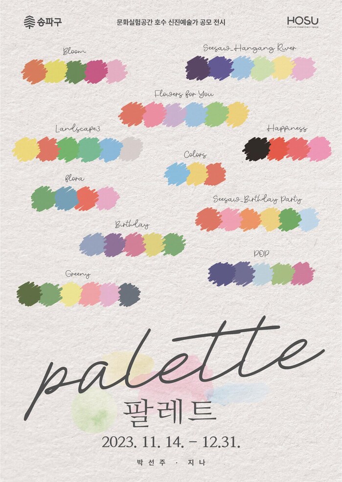 [시민일보 = 이대우 기자] 서울 송파구(구청장 서강석)가 석촌호수에 위치한 문화실험공간 호수에서 신진예술가 공모 첫 전시 ‘팔레트 Palette’展을 14일~12월31일 개최한다.