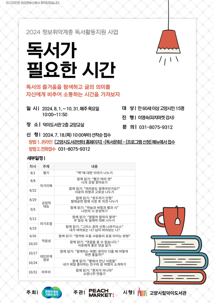 [시민일보 = 민장홍 기자] 경기 고양시 덕이도서관은 경기도가 주최하고 피치마켓이 주관하는 ‘2024년 정보취약계층 독서활동 지원사업'에 선정돼 오는 8월1일부터 10월31일까지 매주 목요일 '독서가 필요한 시간'을 운영한다고 밝혔다.