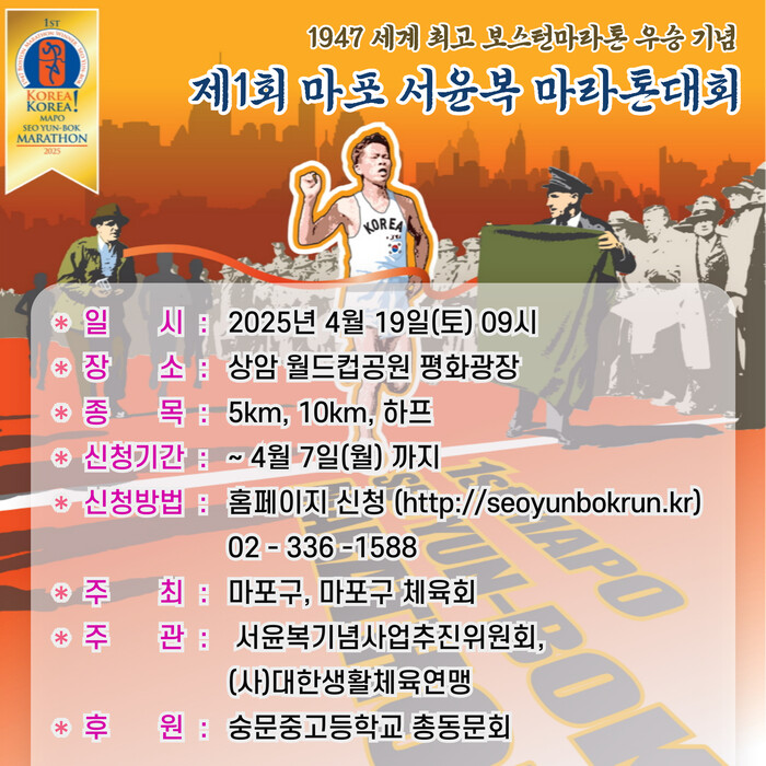 [시민일보 = 문민호 기자] 서울 마포구(구청장 박강수)는 오는 4월19일 ‘제1회 마포 서윤복 마라톤 대회’를 월드컵공원에서 개최한다고 4일 밝혔다.