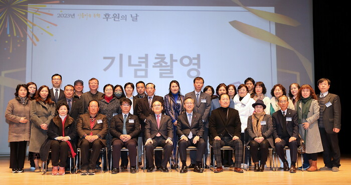 서울 (재)금천미래장학회는 지난 28일 ‘2023년도 아름다운 동행, 후원의 날’을 개최했다. 사진은 유성훈 구청장(앞줄 오른쪽 네 번째)과 관계자들이 기념촬영을 하고 있는 모습. (사진=금천구청 제공)