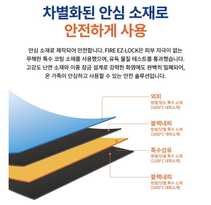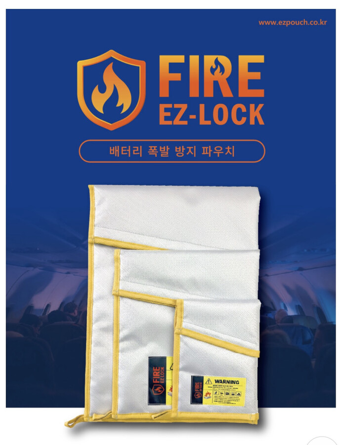 ㈜스마트이지 파이어이지락(Fire EZ-Lock) 3종 기내용배터리파우치는 안전과 직결된 제품 특성상 안정적인 생산과 균일한 품질을 유지하기 위하여 전제품 국내생산(MADE IN KOREA)하며, 1200도 이상의 고열에 견딜 수 있는 특수 방염소재를 사용하여 보조배터리가 폭발하여도 화염이 밖으로 나오지 않도록했다.
