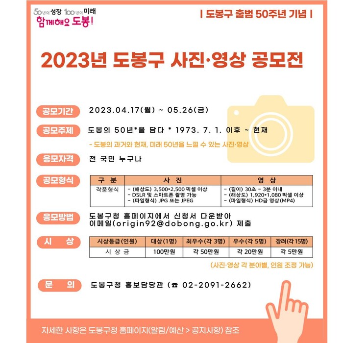 [시민일보 = 여영준 기자] 도봉구(구청장 오언석)는 오는 5월26일까지 '도봉의 50년을 담다, 2023년 사진·영상 공모전'을 연다고 밝혔다.